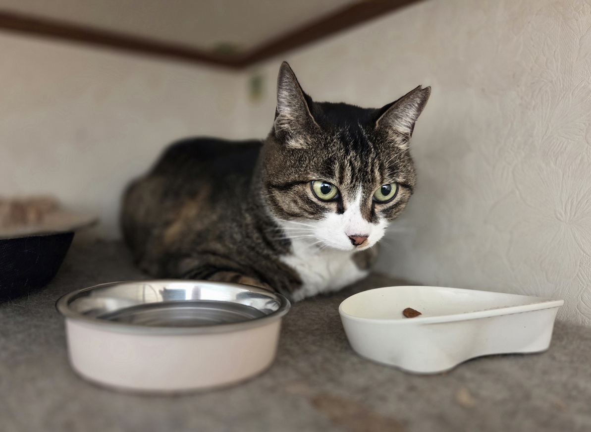 2025/4/13 きゃあぁっ。痩せっぽっちのミクちゃんが食欲モリモリになって少し安心してたら、今度は次女のくるみ嬢までが食いしん坊に。('Д') 早くも初夏が近付いたのねぇ。猫ちゃんたちの胃袋や体調にも薫風が吹いて……でも、暴風雨だけは吹かせないでね。(^^)